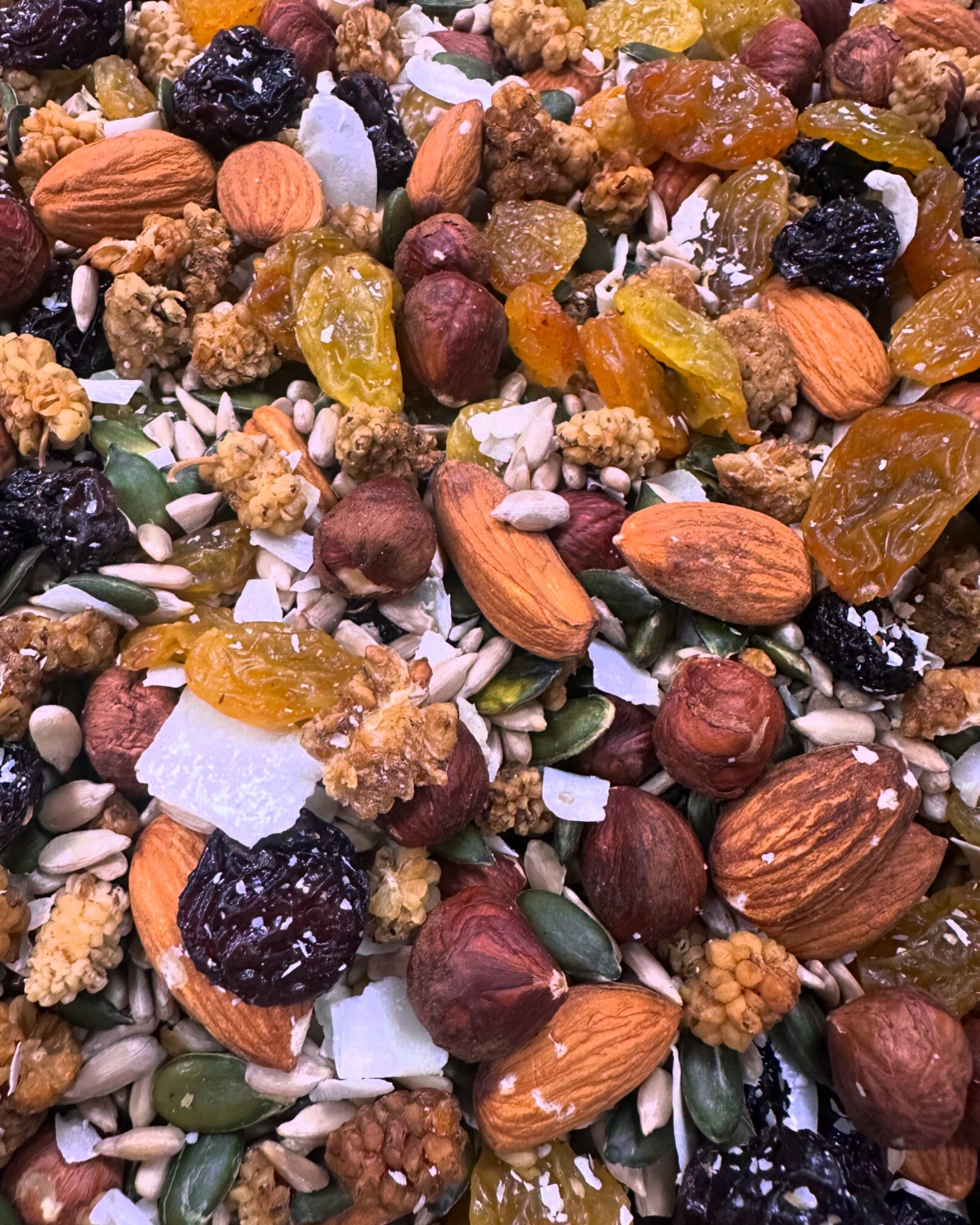 Heerlijke mix van, bruine amandelen, bruine hazelnoten, moerbeibessen, gele en blauwe rozijnen, pompoenpitten, zonnebloempitten en rauwe kokos slices1