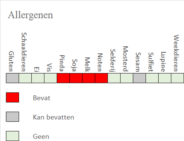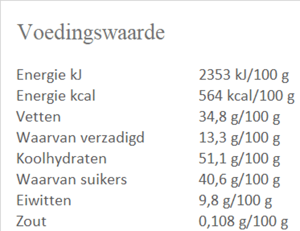 Suiker, AMANDELEN, Volle MELKpoeder, Cacaoboter, Cacaomassa, Kaneel/poedersuiker, Arachide olie (PINDA), Emulgator (E322) SOJA lecithine, Natuurlijk vanille aroma, Glansmiddel (E414)